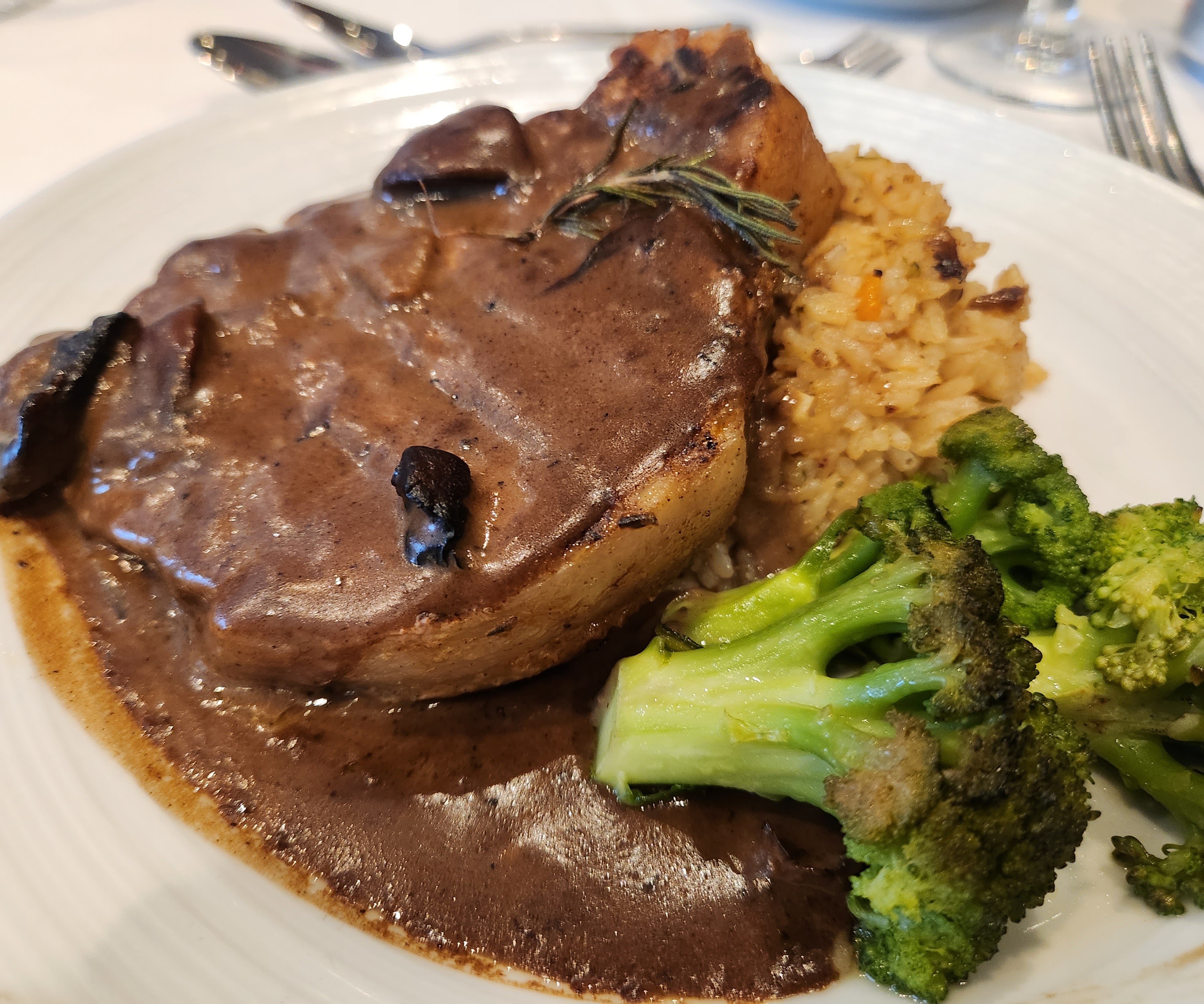 Grabbed some delicious WARM food after a quick hot shower before heading to the pub to end the night for some music while importing photos. Ok, to be fair, maybe only the pork chop was warm, but it was all delicious.