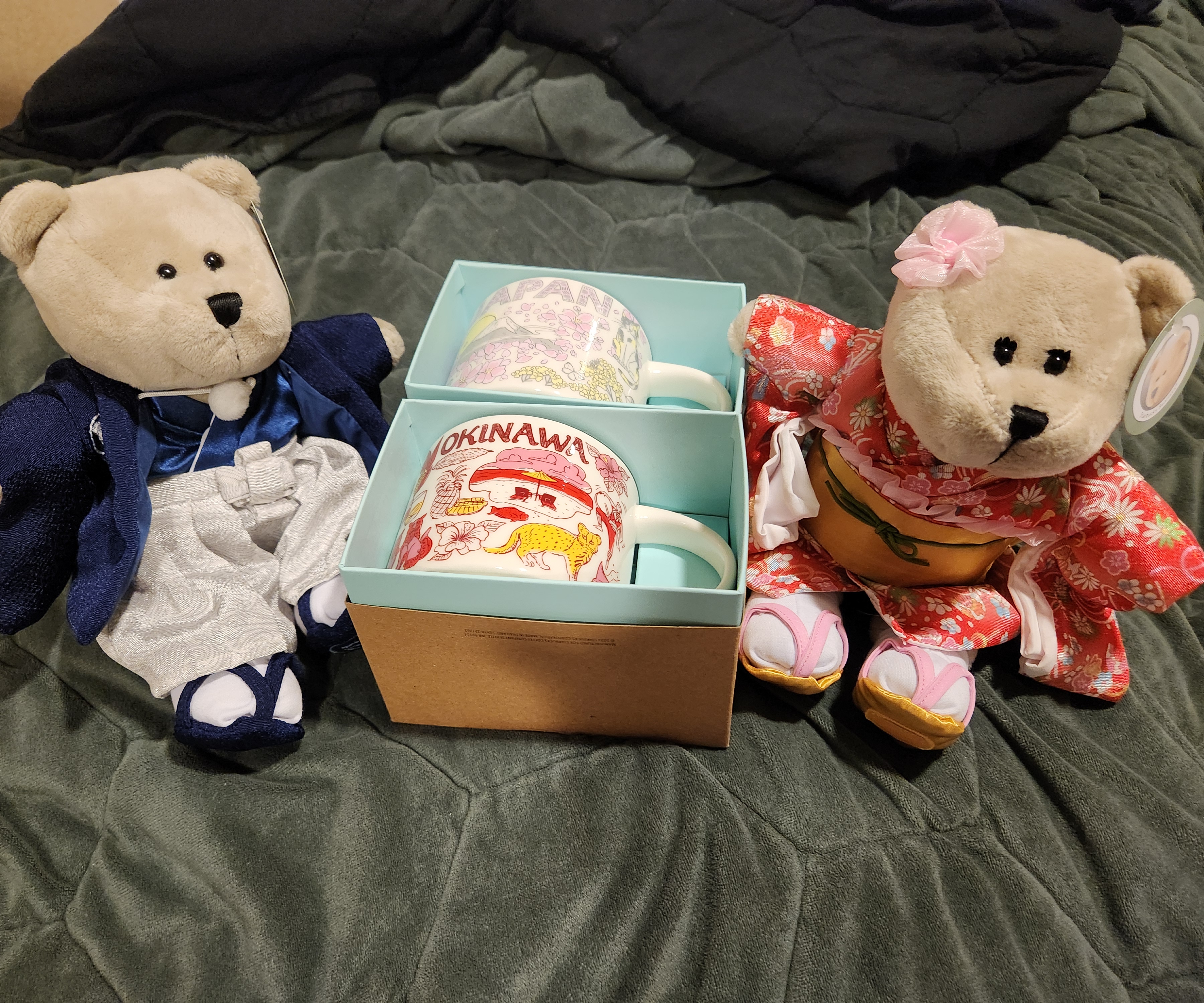 Stopped by a starbucks at some point as well, and got a spring edition of the Japan mug with cherry blossoms, and an Okinawa mug. They also had these adorable kimono bearistas, so added them to the collection. They met the kangaroo bearista, the tiger bearista and the lion dance bearista in the room and have huddled in a corner.