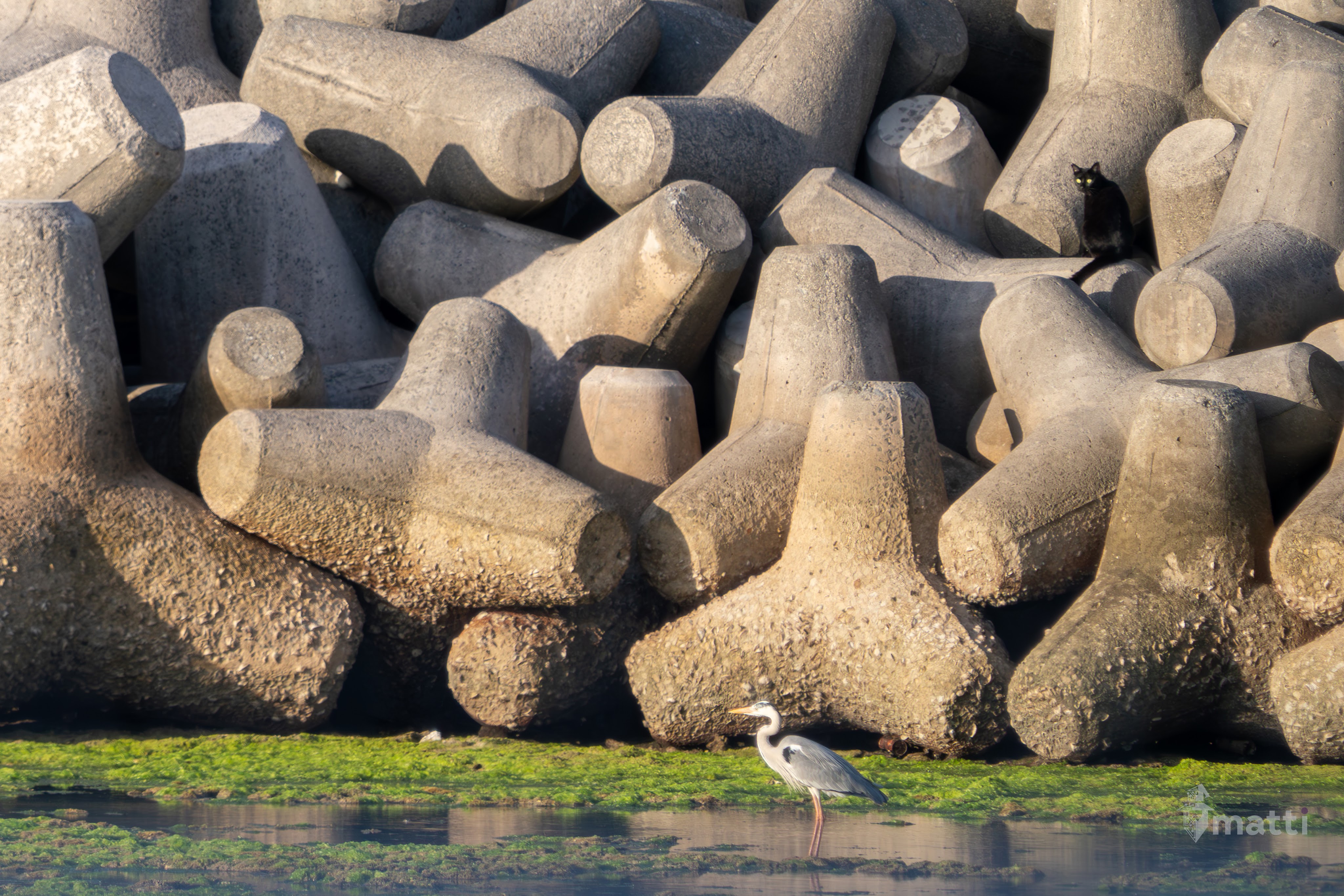 Didn’t want to walk all the way back to port, so we took a taxi. When we got out, I noticed there was a heron out in the port, so I went to take a photo, only to notice later through the viewfinder that there was also a black cat diligently watching from above. Good times.