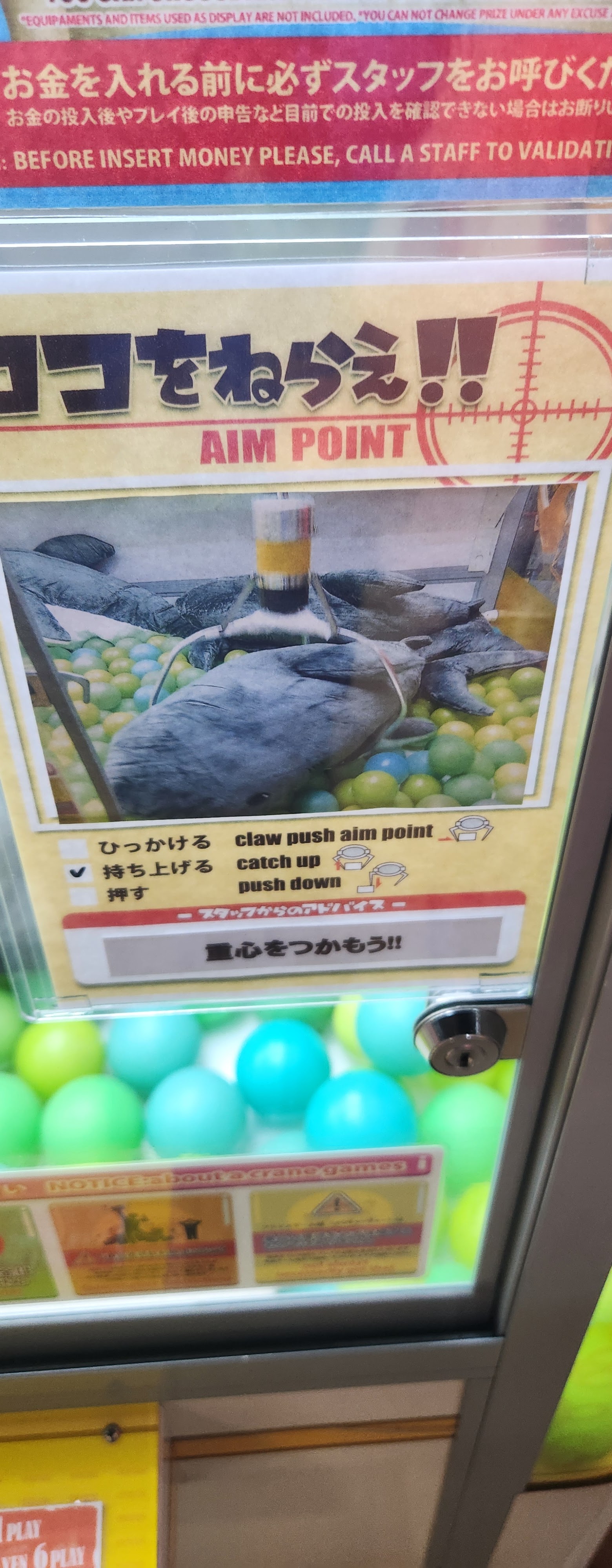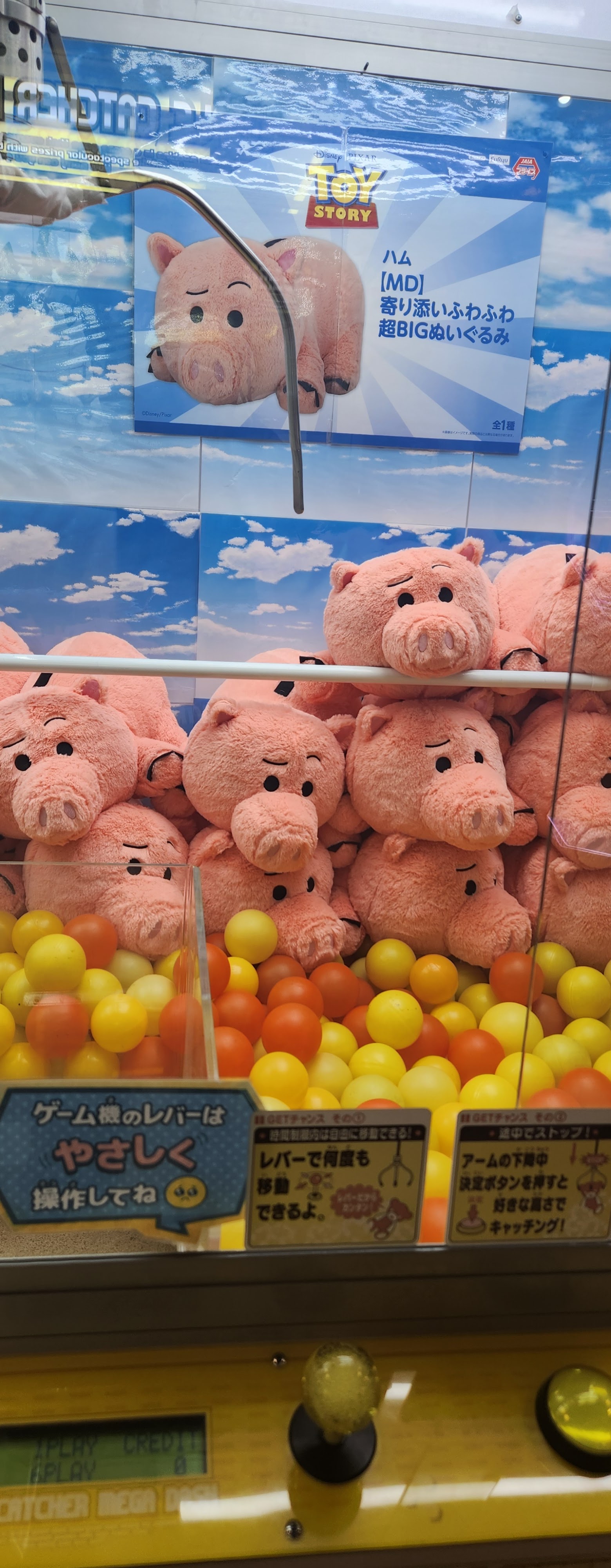 I noticed the claw machine had some interesting instructions, and realized that you actually have a slightly different system here, you don’t just let the claw go all the way to the bottom here, you tap the button a SECOND time when you want it to close, and you need to time it right so it doesn’t just scrape along the bottom of the machine. Got a Hamm on the second of six plays (so the rest of them were useless cause there’s only one in the machine at a time), but he’s adorbs and love his skeptical eyebrows…it’s very…me.