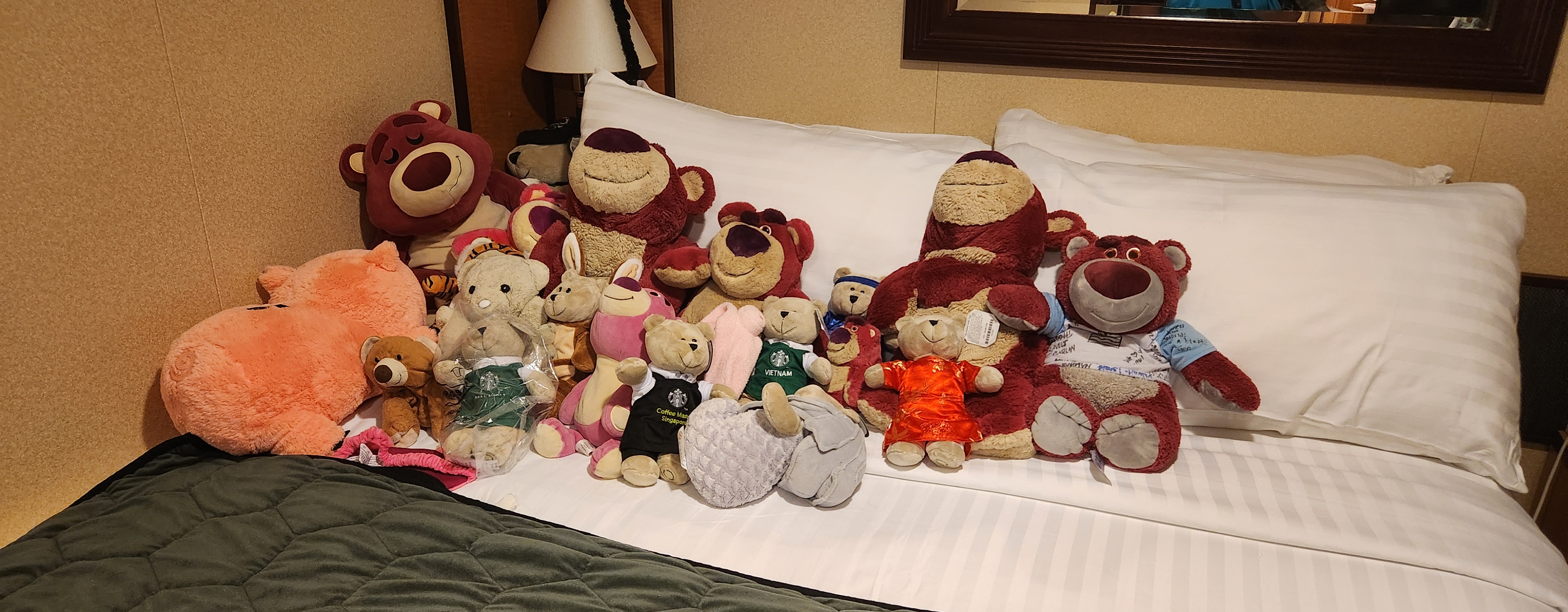 Not much extra stuff going on other than we used the cruising day to finally try to move the two mattresses up against the wall so that the crack in the middle that forms every night would be harder to come by. I came back to the room to find all the lotsos and all the bearistas had taken over and are expanding their presence on the bed, but mostly they get pushed over to the wall.